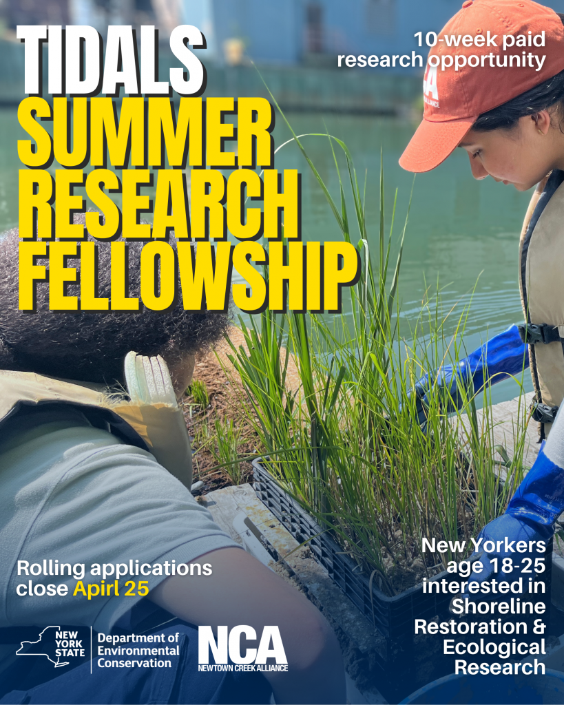 This paid, 10-week, part-time research fellowship is intended for New Yorkers aged 18-25. The program will comprise research on the impact of shoreline restoration in Newtown Creek and mapping of locations where future salt marsh and intertidal habitats can be created to support natural ecology. Through hands-on research, site visits, and field work, fellows will gain an understanding of how intertidal marshes can support biodiversity, improve water quality, and contribute to long-term revitalization efforts in the Creek.